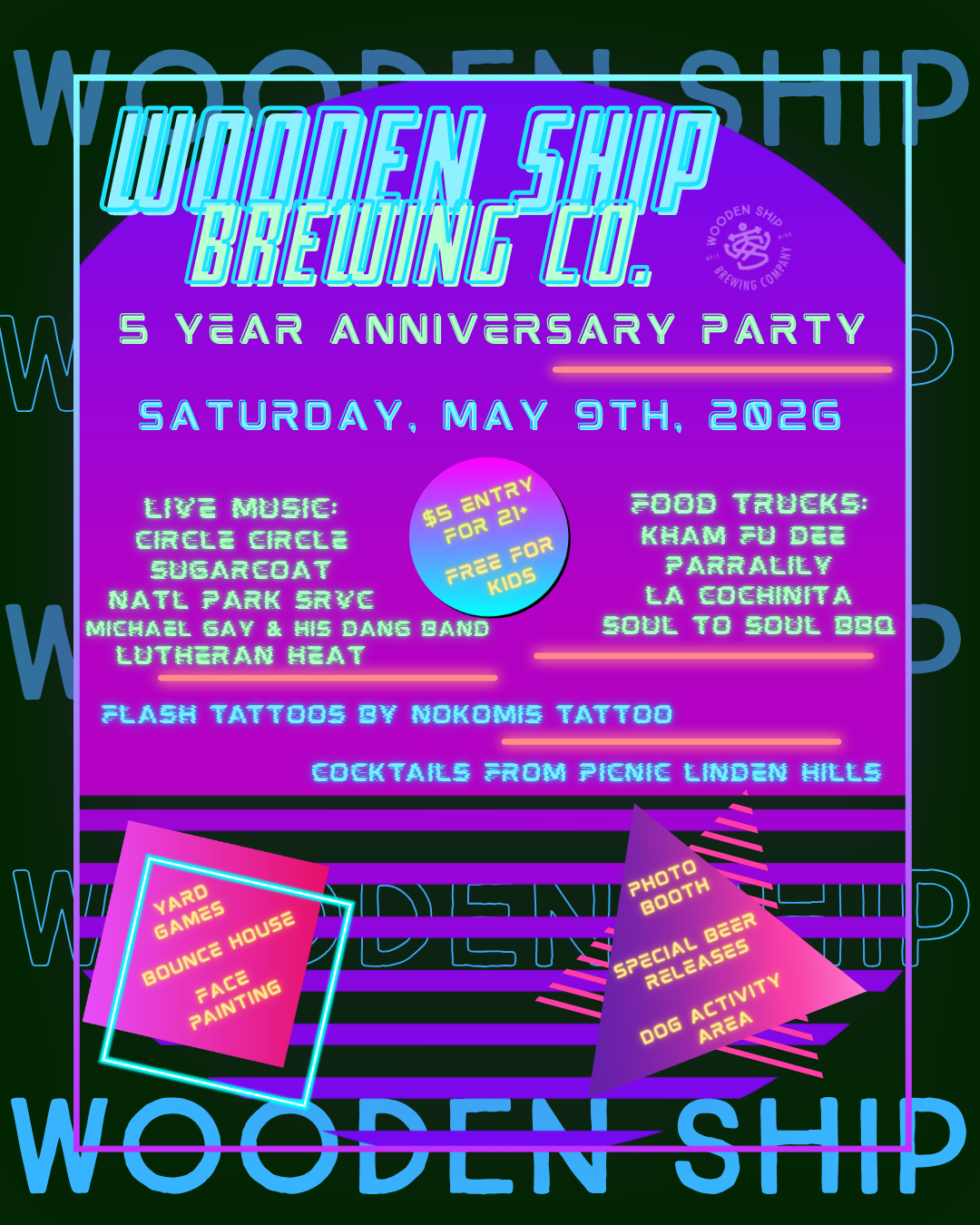 Get ready to party with us and celebrate FIVE YEARS of Wooden Ship Brewing! Saturday, May 9th from noon until 10pm we’ll have a street party filled with live music, food trucks, activities for kids AND dogs, and more!